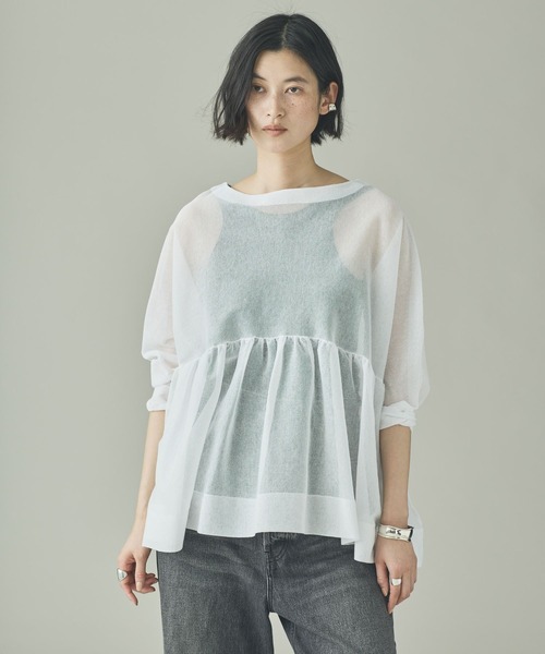 軽やかなシアー感とたっぷりのギャザーが目を惹く華やかなニットプルオーバー ■デザイン ・胸下からたっぷりと寄せたギャザーが美しいドレープを生む存在感のあるデザイン。 ・ゆったりとした身幅のリラクシーなシルエットに、軽やかなシアー感で女性らしさをプラス。 ・サイドに抜けたネックラインが、上品で華やかさと大人っぽさを両立。 ・ボトムスを選ばず、ボリュームのあるスカートとも相性◎。 ・夏は一枚で、春はジャケットのインナーとして透け感を楽しむスタイリングががおすすめ。 ■素材 / お手入れ方法 ・コットンとポリエステルを16ゲージで編み立てた、軽量でシアーなニット素材。 ・ほどよいハリがあり、ギャザーのふんわりとした広がりをすっきりとキープ。 ・体にまとわりつきにくい薄手素材で、涼やかな着心地を実現。 ・通気性に優れ、春夏のシーズンを通して快適に着用可能。 ※繊細な素材のため、アクセサリーやバッグの金具による引っ掛け等にご注意ください。 【Curensology(カレンソロジー)】 旅とは、非日常と日常の間を行ったり来たりしながら、その土地の空気や風景、文化、歴史、そして出会いを、五感のすべてを使って受け止めること。「カレンソロジー(Curensology)」は、そんな旅をイメージした、知的でエレガントな女性のためのワードローブとテキスタイルを提案。バカンスや出張に持っていきたい機能的なアイテムをはじめ、日々の暮らしをアップデートする新しいデザイン、着心地の良いエッセンシャルなものなどを展開しています。 ※サンプルにて撮影をしておりますので、実際の商品とは仕様や加工・サイズ等が若干異なる場合がございます。 ※屋外の光や照明の当たり具合で、実物と色味が異なって見える場合がございます。詳細画像の色味をご確認ください。 なお、商品の色や質感を出来るだけ忠実に再現するよう心掛けておりますが、パソコンなどの環境により、実物と若干異なる場合がございます。 ▼商品のお気に入り登録をおすすめします▼ ♡をクリック!完売カラーの再入荷や、ラスト1点の通知、セールの際の通知を受ける事ができます。ブランドのお気に入り登録もご一緒にお願い致します。