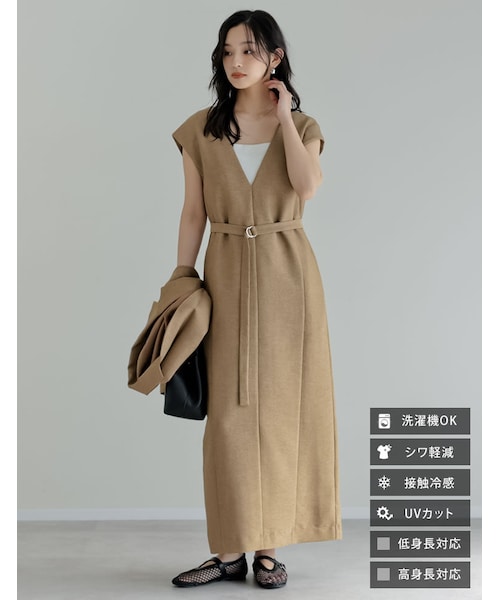 ▼デザインさらりとした風合いのドライタッチなホップサックツイード生地の、Vネックジャンパースカート。シンプルだからこそ、シルエットとサイズ感の美しさを追求し、大人の装いに自然と馴染む一着に仕上げました。最大の特徴は、お顔周りをすっきりとシャープに見せてくれる深めのVネックライン。シルエットはストンと落ちるIラインをベースに、身体のラインを拾いすぎない絶妙なゆとりをプラス。リラックス感がありながらも、縦のラインを強調することで、品の良さをしっかりとキープします。ホップサックツイードならではの表情豊かな素材感が、シンプルなインナー合わせでも装いに奥行きを添えてくれます。UVカット加工で、日差しの強い日のお出かけも安心。洗濯機対応でシワになりにくいため、イージーケアで毎日のお手入れも簡単です。▼コーディネートシアートップスやリブニットを合わせた、クリーンで知的なレイヤードスタイルは、オフィスやきれいめなお出かけにおすすめ。袖にデザインのあるブラウスを合わせれば、会食やイベントシーンにも映える華やかな装いが完成します。足元はパンプスやフラットシューズで軽やかにまとめることで、春夏らしいバランスに。インナー次第で印象を変えられるため、季節の移り変わりに合わせて長く活躍します。▼素材さらりとした風合いのUVカット・接触冷感機能付きのホップサック生地▼UVカット・ドライタッチホップサックシリーズオフィスカジュアルにも適した、さらりとした肌触りの良いホップサック生地を使用。UVカット機能・接触冷感・シワになりにくい高性能な生地です。ドライタッチホップサックダブルテーラードジャケット(商品番号:140127)ドライタッチホップサックビスチェ(商品番号:140131)ドライタッチホップサックナロースカート(商品番号:140211)ドライタッチホップサックツイードドロストリラックスパンツ(商品番号:140128)ドライタッチホップサックツイードVネックジャンパースカート(商品番号:140129)ドライタッチホップサックツイードストレートパンツ(商品番号:140132)ドライタッチホップサックツイード半袖シングルジャケット(商品番号:140130)▼低身長向けC(コンパクト)サイズ対応身長150~155cmくらいの方がバランスよく着ていただける丈感のリエディオリジナルサイズです。▼高身長向けT(トール)サイズ対応身長165~170cmくらいの方がバランスよく着ていただける丈感のリエディオリジナルサイズです。