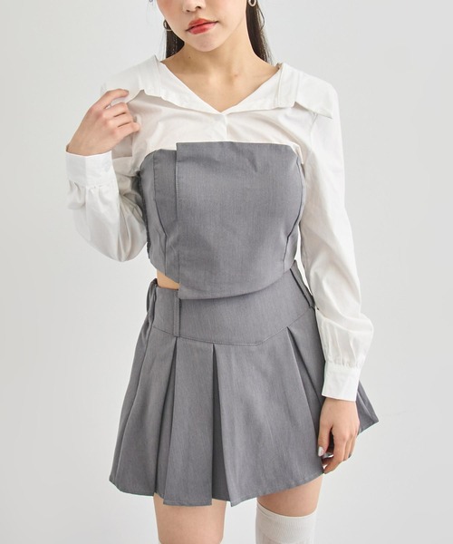 洗練とエッジを纏う、Kムードの最旬セットアップ ●計算されたバランスが、視線を奪う。 ●クリーンなブラウスと構築的なプリーツが生み出す、凛とした存在感。 ●甘さに頼らず、シルエットで魅せる一着。 ♦detail 立体感のあるショルダーデザインが印象的なブラウスに、コンパクトなビスチェ風トップスをレイヤードしたようなデザインがモードな雰囲気を演出します。 ウエスト位置を高く設定したボックスプリーツスカートは、腰まわりをすっきり見せながら自然なフレアラインを形成。 上下で統一感のある素材使いがスタイリングを完成させ、セットで着るだけで洗練されたバランスが整います。 単品使いもしやすく、着回し力の高さも魅力です。 ♦styling 〇クールに攻めたい系統→ロングブーツやタイトなトップスを合わせて、モノトーンでまとめたシャープなスタイリングに 〇韓国ストリート寄りにしたい系統→ルーズソックスや厚底ローファーを合わせ、ヘアアクセでアクセントをプラス 〇きれいめに着こなしたい系統→ジャケットを羽織り、ヒールブーツと合わせて都会的なバランスに仕上げる ♦コーデにオススメ ドット柄 スカーフ (159-6020) 厚底 ローファー (799-9449) ----------- 伸縮性・・・あり/なし 透け感・・・あり/若干あり/なし 光沢感・・・あり/なし 生地の厚さ・・・薄め/普通/厚め ポケット・・・あり/なし 裏地・・・あり/なし ----------- ※ウエストゴムあり ※商品のお取扱いに関しましては、商品に付属のアテンションカード、洗濯ネームをご覧ください。 ※モデル着用画像は光の当たり具合で色味が違って見える場合がございます。 ※商品の色味の目安は、商品単体の画像をご参照ください。 【お買いものをお楽しみいただく為に!】 ▼商品のお気に入り登録 完売カラーの再入荷通知や、ラスト1点の通知、セールの通知も受け取ることができます。 ▼ブランドのお気に入り登録 新商品や再入荷など、いち早くブランドのお得な情報を受け取ることができます。