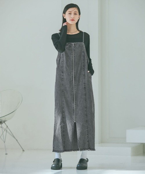 裾のフリンジデザインがポイントのジャンパースカート。 肩紐のアジャスターで長さも調整でき、後ろ部分にゴムも使用しているので着脱もしやすい仕様の1点です。 長めの着丈なので大人っぽく着られ、フロントのZIPもアクセントに〇 【素材】 綿混の柔らかな素材感。 【スタイリング】 シンプルなカットソーやニットとの相性〇 端境期には羽織合わせのスタイリングもおすすめです。