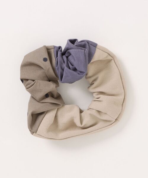 3種類の生地を繋いだシュシュです♪ 落ち着いた色味ながら、爽やかな印象のドット柄の生地を選びました。 使用した生地は、古着から再生されたアップサイクル生地。 サステナビリティを大切にした、遊び心のあるシュシュ。 忙しい朝に、お家でのリラックスコーデに、さっとまとめるだけで髪形が整うシュシュは、とっても便利なアイテムです☆