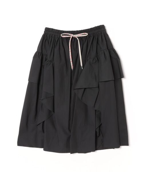 大胆にフリルをたっぷりと施した華やかなデザインのギャザースカート。無地ブラックとグレーチェックの展開。甘くなりがちなデザインを落ち着いたカラーで大人なムードにアップデート。