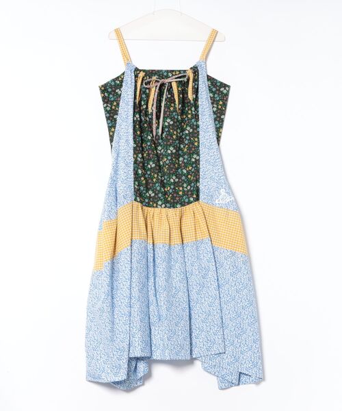 英国リバティ社のギンガムチェックとフラワープリントの生地を採用した、ブロッキングが華やかなキャミワンピース。ビスチェのような切り替えがセンシュアルで、女性らしいキャミソールワンピース。スカート部分はブランドアーカイブのスカートパターンよりアレンジされたデザイン。左腰辺りにフラワーORB刺繍がワンピ―スに華を添えます。