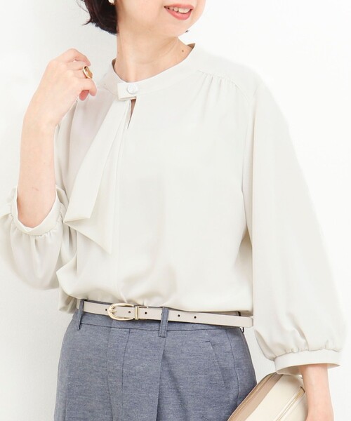 ◇26SS◇ MICO COULIER オフィスにちょうどいい華やかさ とろみのあるカルゼ素材と、さりげないギャザー使いが上品なボウタイブラウス。 きちんと見えして、一枚でもジャケットインにも映えるオフィススタイルに頼れる一枚です。 ◆Point ・とろみのある、さらりと滑らかな肌触りのよいカルゼ素材 ・きれいめな印象のボウタイ7分袖プルオーバー ・袖口や肩に施したギャザーが上品な華やかさをプラス ・後ろパールボタンでバックスタイルも抜かりなく ・インしなくてもサマになるデザイン ・一枚着はもちろん、ジャケットインでも映える ・やわらかな春カラーが好印象で新生活にも◎ ・シワになりにくいイージーケアでオフィスシーンにおすすめ ・オンオフ問わずきれいめスタイルに活躍するトップス ---------------------------------------------------------- 透け感:オフホワイト・サックスブルー:ややあり、ピンク:若干あり、ネイビー:なし 裏地:なし 伸縮性:ややあり 光沢感:若干あり 生地の厚さ:普通 洗濯:手洗い可 ---------------------------------------------------------- ●お取扱い上のご注意● 末永くご愛用頂くために、アテンションタグを必ずご確認の上、着用又はお取り扱い下さい。 ※店頭及び屋外での撮影画像は、光の当たり具合で色味が違って見える場合があります。商品の色味は、スタジオ撮影の画像をご参照下さい。 ※商品画像に関しては出来る限り忠実に表示出来るよう努めておりますが、お客様がご利用のモニターの設定及び特性により、実際の商品と比較し色味に若干の誤差が生じる場合があります。 ※製品洗い加工の商品は、多少の歪み、シワなどが見られたり、風合いやサイズ等が1枚1枚異なります。汗や雨等で濡れた時や、摩擦により色落ちし、他の衣料を汚すことがありますので(特に濃色のもの)ご注意ください。 ---------------------------------------------------------- ◇商品のお気に入り登録◇ 気になる商品は、お気に入り登録がオススメです! クーポン情報や入荷情報など、通知されるようになります。 ---------------------------------------------------------- <MICO COULIER> 今の気分をノーリーズらしく取り入れたデイリーアイテムを提案します。 ウエアからグッズまで幅広いラインアップ。やわらかく透明感のある着こなしで新しい自分を発見。MICO COULIERの商品につきましてはアウトレット店舗にて展開をしております。