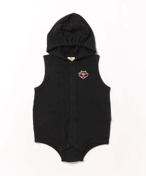 立体的なつのとしっぽの存在感がGOODなDEVILKIIN裏毛のロンパースはインナーを変えて色々着回しができる嬉しい1枚。フロントはシンプルですが光沢感のあるDEVILKINの刺繍のワンポイントに注目☆フード部分も中心にゴムが入っていてベビーちゃんの頭にちゃんとフィットするように工夫されたこだわりの1枚です。