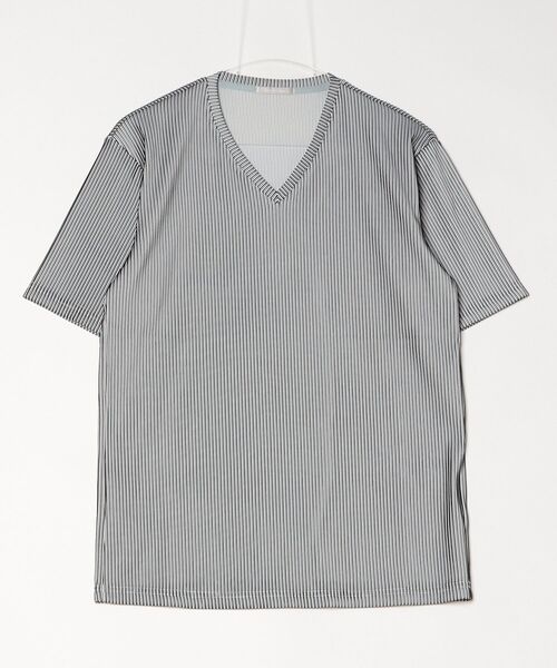 ■HIGH STREET■ 【DESIGN】 程よい艶を帯びたグラデーション調のリブ素材が、ミニマルなVネックTシャツにさりげない品と存在感を添えます。 身体に沿うタイトなシルエットは通年で活躍し、計算されたVネックの開きが一枚でも抜けすぎないバランスを実現。洗練された印象をキープします。肩まわりはすっきりと構築的に設計し、ジャケットやアウターのインナーとしてもスマートに収まる一着です。 【TEXTILE】 特殊な編み組織でグラデーション調ストライプを表現したリブジャージ素材。さらりとした肌触りと高いストレッチ性を備え、独特の陰影ある表情とともに快適な着用感を実現しています。