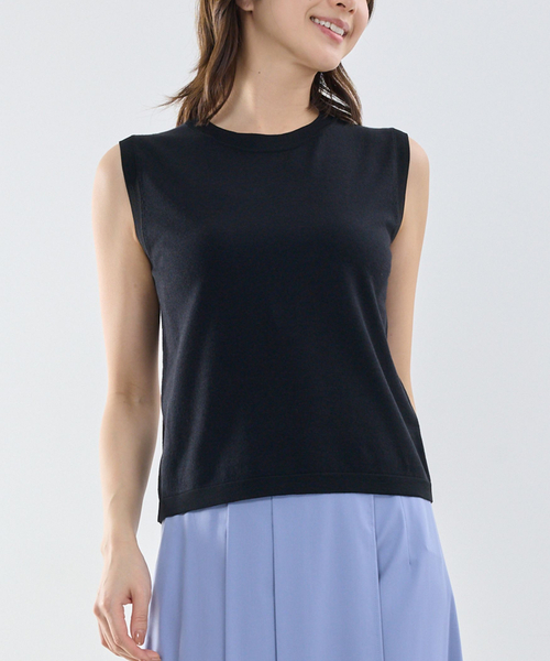 調温機能糸を使用した、ノースリーブニットプルオーバー。細番手の糸で編み立て、春夏仕様のさらりとした肌触りに仕上げています。シンプルながらきちんと感のある表情で、一枚でも上品に着用できるデザイン。同素材カーディガン(30-61-14-916)と合わせてアンサンブルとしても楽しめ、単体でも幅広いスタイリングに活躍します。 ・カラー展開はブラック、ピンク、ブルー ・サイズ展開は1(M)9号・2(L)11号・3(2L)13号
