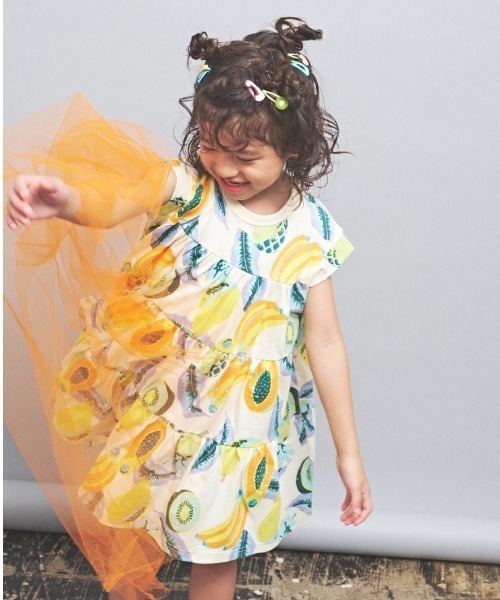[140]もあります 「トロピカルフルーツ柄」は、マルークデザイナー描き下ろしのオリジナルグラフィックです。「トロピカルフルーツ柄」は、キウイやパイナップル、パパイヤなど南国を代表するフルーツをモチーフにした華やかなデザイン。鮮やかな色彩とみずみずしい表情がリゾートの解放感を感じさせ、着るだけで気分が高まります。夏の日差しに映える、華やかで遊び心のある柄です。・程よく薄手のコットン天竺素材で暑い夏も心地よくすごせます・総柄のワンピースは1枚でもぱっと目をひきます・広がりのあるティアードシルエットがかわいく、ポケット付きで便利です・マルークでは毎年とても人気のアイテムです ● maarook (マルーク) 2009 A/Wよりスタートしたベビー + キッズ + おとな服 size: 70 ~ 150cm F(160cm) かわいいだけじゃない、 シンプルなだけでもない クールだけどちょうどいいバランスの服をつくっています