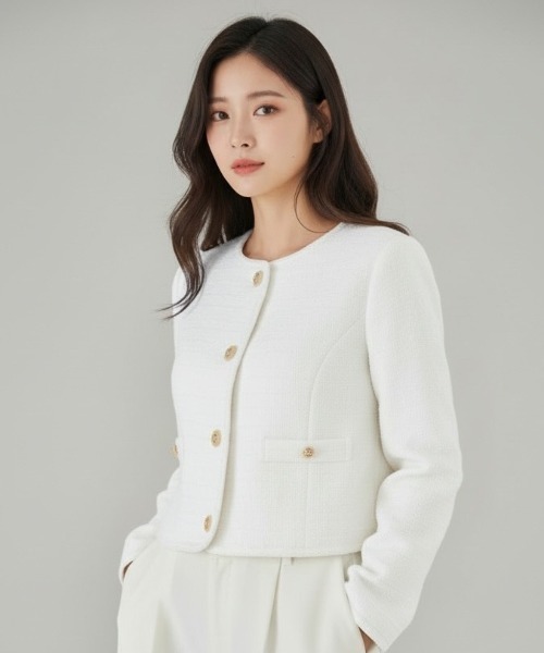 【上品な華やかさを纏う、ラメツイードノーカラージャケット】 【Point】 ・繊細なラメ糸を織り込んだツイード素材が、上品で華やかな印象を演出します。 ・縁にあしらったブレードテープがクラシカルなアクセントに。 ・ゴールドモチーフをあしらったボタンが、さりげない高級感をプラスします。 ・コンパクトな丈感でスタイルアップ効果抜群◎ ・セレモニーや通勤はもちろん、デニム合わせで上品カジュアルにも活躍する一枚です。 ケア方法:ドライクリーニング 透け感:なし 裏地:あり 伸縮性:なし 光沢感:なし 生地の厚さ:中肉 M:(01):着丈 45.5㎝/バスト 96㎝/肩幅 34㎝/袖丈 59㎝/袖幅 17㎝/袖口幅 14㎝/ウエスト 34㎝/裾回り 98㎝ (02):着丈 47.5㎝/バスト 100㎝/肩幅 35㎝/袖丈 59㎝/袖幅 17.5㎝/袖口幅 14.5㎝/ウエスト 37㎝/裾回り 102㎝ S:(01):着丈 45.5㎝/バスト 96㎝/肩幅 34㎝/袖丈 59㎝/袖幅 17㎝/袖口幅 14㎝/ウエスト 34㎝/裾回り 98㎝ (02):着丈 47.5㎝/バスト 100㎝/肩幅 35㎝/袖丈 59㎝/袖幅 17.5㎝/袖口幅 14.5㎝/ウエスト 37㎝/裾回り 102㎝
