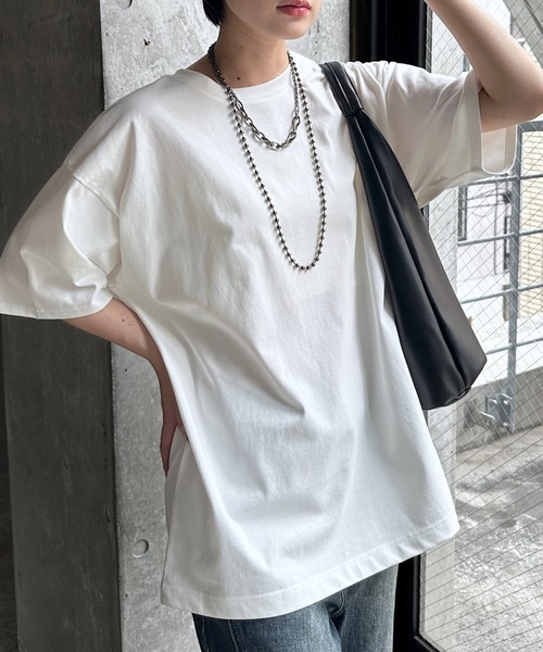 \大人の余裕を感じさせる、計算されたルーズシルエット/ 【汗じみレス→ZIMILESSシリーズ】 「濃い色は汗が目立つ…」という悩みを解消。 生地の内側は吸水速乾、外側は撥水。の機能素材により、グレーなどの色も、汗が気になりにくく一日中スマートに着こなせます。 毎年大人気の「体型カバー×スタイリッシュ見え」を両立したビッグTシャツが今年も登場。 シンプルながらも、着るだけでサマになる絶妙なサイズ感と「オンナマエ」な雰囲気が叶う一着です。 ヒップラインまで隠れる長めの丈感と、腕を華奢に見せてくれるドロップショルダー。 リラックス感がありつつも、ルーズになりすぎない落ち感が魅力です。 ワイドパンツや重めのサンダルと合わせて、ブランドらしいクールなスタイリングに。 パールやチェーンネックレスが映える、ネックライン。アクセサリー次第で表情が変わる万能アイテムです。 〈注意事項〉 ・サンプルにて撮影をしておりますので、実際の商品とは素材や仕様・加工・サイズ等が若干異なる場合がございます。 ・モニター・環境等により実際の商品と色味が多少異なって表示される場合がございます。予めご了承をお願いいたします。 ・撮影環境により、光の当たり具合で色味が違って見える場合があります。あらかじめご了承下さい。 ▼気になるアイテムは《お気に入り登録》がおすすめです! 完売カラーの再入荷情報、セール情報、ラスト1点の通知を受け取ることができます! ▼《ブランドのお気に入り登録》で新商品や再入荷などのお得な情報をいち早くお知らせします。 ※ご注文いただいた予約商品のお届け時期の確認は、注文履歴ページより行えます。
