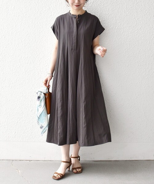 【26SS】 〈デザインポイント〉 自然なフレアシルエットが女性らしい印象のロングワンピース。 縦に伸びるシームラインとスタンドカラー、比翼仕様のフロントで上身頃はすっきりと、ウエストから広がるフレアでメリハリのあるシルエットに仕上げました。 落ち感のある素材で広がりすぎず、やや肩が落ちるフレンチスリーブが気になる二の腕まわりを自然にカバーしてくれます。 〈生地・素材のポイント〉 ・家庭洗濯可能(洗濯機OK) とろみのあるレーヨンナイロンのツイル素材を使用。 〈コーディネート・その他〉 裏地がないアイテムなので、デニムやサテンパンツと合わせたレイヤードスタイルがおすすめ◎ ------------------------------------- 生地の厚み:薄手 伸縮性:無 透け感:無(淡色のみやや有) 光沢感:やや有 水洗い:洗濯機可 ------------------------------------- ※製品の特性上、洗濯の後に縮みや型崩れ、斜行(ねじれ)が生じますのでご留意ください。 ※屋外での撮影画像は、光の当たり具合で色味が多少異なって見える場合があります。商品の色味は、スタジオでの詳細画像をご参照ください。 ※末永く愛用頂く為に、アテンションタグ・洗濯ネームを必ずご確認の上、着用又はお取り扱い下さい。 ※画像の商品はサンプルです。 実際の商品と仕様、加工、サイズが若干異なる場合がございます。