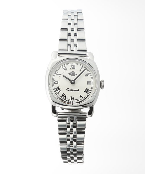 Rosemont NS001 - デザイン ロゼモンノスタルジアのSコレクション。上品で柔らかなカーブを帯びたクッションケースが魅力のモデルです。クラシカルなローマ数字文字盤がアクセント。 - ディテール ・Ref:NS001-SWR ・ケース素材:ステンレス ・ブレスレット素材:ステンレス ・ムーブメント:クォーツ / 電池式 ・形状:クッション ・平均月差:±15秒 ・防水性:3気圧 / 日常生活防水 ・生産国:スイス ・保証期間:1年間 ・付属品:HIROBの保証書 / ボックス ・保証書 / 購入明細について 保証書と購入明細は合わせてご保管をお願いいたします。修理ご希望の際は、保証書と購入明細をご提出ください。購入明細はマイページ上から閲覧・印刷していただけます。 ・保証について HIROBより1年間の保証をお付けしております。修理が必要になった際は弊社工房でアフターサポートをしております。 ・モニター電池について 時計にセットされている電池は、機能や性能に問題がないかをチェックするモニター電池です。お買い上げいただく時期によって電池残量が変動いたします。新品の電池よりも、稼働時間が短い可能性が考えられます。 ・時計の時刻について お届け時の時計の時刻(日付含む)は実際と異なる場合や、リュウズが上がっており動作していない可能性がございます。お手数ではございますがご確認いただき、必要な場合は時刻合わせをお願いいたします。 ・サイズ調整について HIROB各店舗にて承っております。店舗の状況やモデルによりお時間をいただく場合や、弊社工房でのお預かり対応になる場合がございます。 ・Rosemont / ロゼモン 1951年にジュネーブで登録され、スイス時計産業の発祥地で1973年に本格始動したロゼモンt。当時のロゼモンtは高級木材のローズウッドを使用した置時計を製造しており、“Rosemont”の名前はROSE MONTRE (薔薇の時計)に由来しています。クラシックなデザインとスイスメイドにこだわる人気ブランドのひとつ。