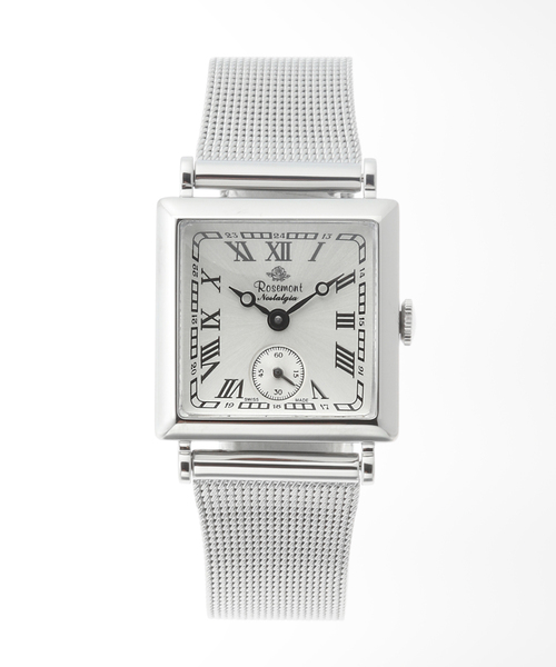 Rosemont N011 - デザイン ロゼモンのノスタルジアコレクション 。1950年代に流行したスクエアケースを採用したモデル。凛としたアンティーク調のデザインと、女性らしさを引き立てる洗練されたフォルムが特徴です。サンレイ仕上げのシャンパンゴールド文字盤は中心から控えめな放射状の輝きを放ち、さりげない高級感を与えます。 - ディテール ・Ref:N011-SWR ・ケース素材:ステンレス ・ブレスレット素材:ステンレス ・ムーブメント:クォーツ / 電池式 ・形状:スクエア ・平均月差:±15秒 ・防水性:3気圧 / 日常生活防水 ・生産国:スイス ・保証期間:1年間 ・付属品:HIROBの保証書 / ボックス ・保証書 / 購入明細について 保証書と購入明細は合わせてご保管をお願いいたします。修理ご希望の際は、保証書と購入明細をご提出ください。購入明細はマイページ上から閲覧・印刷していただけます。 ・保証について HIROBより1年間の保証をお付けしております。修理が必要になった際は弊社工房でアフターサポートをしております。 ・モニター電池について 時計にセットされている電池は、機能や性能に問題がないかをチェックするモニター電池です。お買い上げいただく時期によって電池残量が変動いたします。新品の電池よりも、稼働時間が短い可能性が考えられます。 ・時計の時刻について お届け時の時計の時刻(日付含む)は実際と異なる場合や、リュウズが上がっており動作していない可能性がございます。お手数ではございますがご確認いただき、必要な場合は時刻合わせをお願いいたします。 ・サイズ調整について HIROB各店舗にて受け付けております。店舗の状況やモデルによりお時間をいただく場合や、弊社工房またはメーカーでのお預かり対応になる場合がございます。 ・Rosemont / ロゼモン 1951年にジュネーブで登録され、スイス時計産業の発祥地で1973年に本格始動したロゼモン。当時のロゼモンは高級木材のローズウッドを使用した置時計を製造しており、“Rosemont”の名前はROSE MONTRE (薔薇の時計)に由来しています。クラシックなデザインとスイスメイドにこだわる人気ブランドのひとつ。