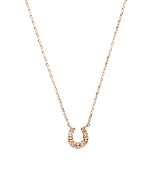 4石のダイヤモンドをあしらった馬蹄のモチーフネックレス。 艶やかなピンクゴールドの華奢なチェーンとダイヤモンド のきらめきが、胸元を上品に見せます。 程よいボリューム感で、デイリー使いにもオススメです。 馬蹄はその形から、舞い込んできた幸運をキャッチしてそのくぼみに溜め込み、持っている人に幸せをもたらすとされ、西洋でも古くからお守りとして親しまれています。 ベーシックで飽きの来ない人気モチーフのネックレスは、ファーストジュエリーやプレゼントにもぴったり。