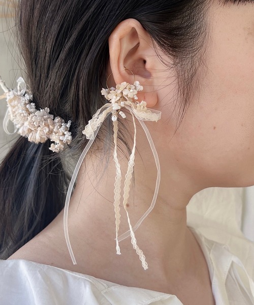 ・*:・ ランタナとガラスビーズのシリーズ・:*・ 可愛らしい小さなランタナの花をモチーフに パールのようなやわらかな光沢のガラスビーズと レースリボンを合わせたシリーズ。 繊細な花々と上品なビーズが重なり ナチュラルで優しい雰囲気に仕上げました。 □ イヤーカフ ランタナの花束を耳に添えるようなイヤーカフ。 長く垂らしたレースリボンが 顔まわりをやわらかく華やかな印象に。 リボンは取り外しができ、シンプルなお花のデザインにも。 サイズが合えば、リングとしてもお使いいただけます。 普段使いはもちろん 卒業式や入学式などのセレモニーシーンや 結婚式などのお呼ばれにもおすすめの布花アクセサリーです。 ランタナとガラスビーズのシリーズ ネックレス / クリップ / イヤーカフ / ブレスレット 【m.soeur(エムスール)*】 m.soeur(エムスール)は京都発のハンドメイドアクセサリーブランドです。 植物の美しさや生命力を表現しつつもお洋服に寄り添うような、ナチュラルでクラシカルなアイテムを 制作しています。 一点一点人の手で作り上げられる手作りのアイテムは温かみがあり、使い込むごとに味わいをましていきます。 ・*:・ ・:*・ ・*:・:*:・:*・ 【注意事項】 ※イメージが変わらない程度に、お花が変更になる場合がございます。 ※こちらは一部手染めを施している商品となります。シミのように見える部分がある場合がございますが、染めの色となり、アンティークな風合いを出すためのものですので、一点一点発色が少々異なった仕上がりとなっております。 ※手作業のため、画像の商品と色、形、大きさが多少異なる場合がございますので、予め御了承下さい。 ※色落ちする場合がございますので水や雨等には十分ご注意下さい。 ※大変デリケートなお作りとなっておりますので、お取り扱いには十分ご注意下さい。