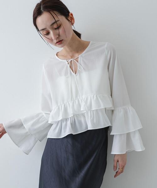 【春を軽やかに纏う。甘すぎないフリルが目を惹くクロップドブラウス】 ・春らしさ満点の軽くてシワになりにくいブラウス生地を採用し、一日中きれいな佇まいをキープ ・裾にあしらった贅沢なフリルがポイント。甘くなりすぎないよう絶妙なボリュームに調整 ・トレンドのクロップド丈に仕上げることで、腰位置を高く見せ自然なスタイルアップを演出 柔らかな風合いと、モダンなディテールが融合したデザインブラウス。段々に重ねたフリルが、クリアでシンプルなコーディネートに等身大の華やぎを添えてくれます。扱いやすいポリエステル素材は、お出かけシーンでもシワを気にせず自分らしく過ごせるのが嬉しいポイント。コンパクトな丈感なので、ハイウエストのパンツやスカートと合わせれば、瞬時に旬の洗練スタイルが完成します。 【2026 Spring/Summer】【26SS】 ※この商品(Y.BEIGE, BLACK)は、直射日光や蛍光灯に長時間あたると変色したり、色褪せすることがありますのでご注意ください。 ※直射日光や蛍光灯に長時間あたると変色したり、色褪せすることがありますのでご注意ください。 ※その他お取り扱いに関しましては、商品に付属のアテンションタグをご覧ください。 ※商品画像は、光の当たり具合やパソコンなどの閲覧環境により、実際の色味と異なって見える場合がございます。予めご了承ください。 ※商品の色味の目安は、商品単体の画像をご参照ください。 ▼お気に入り登録のおすすめ▼ お気に入り登録された商品は、マイページにて現在の価格情報や在庫状況の確認が可能です。 お買い物リストの管理にぜひご利用ください。 素材感 透け感 : ややあり(OFF WHITE, Y.BEIGE) 伸縮性 : なし 裏地 : なし 光沢 : なし ポケット : なし One