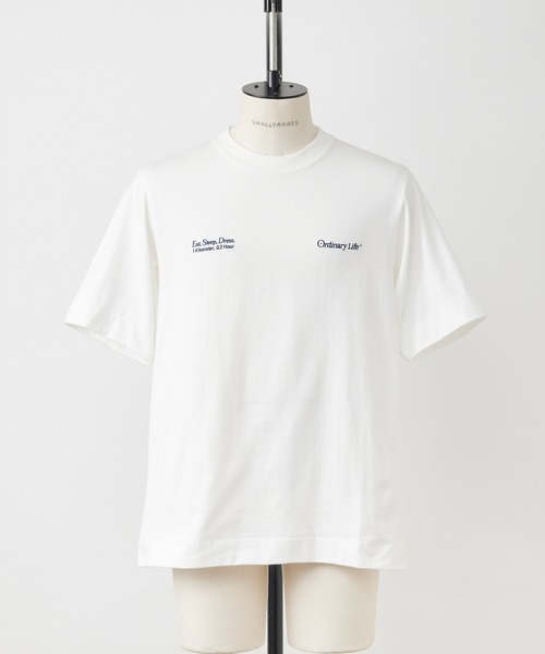 何の変哲もない、日常に溶け込むレギュラーフィットのショートスリーブTシャツ。 是非生活の道具の一つとしてご使用ください。 人間の生活に不可欠な'Eat, Sleep,Dress'(食う、寝る、着飾る)を胸に刺繍しています。 刺繍の1km、0.2hは家から1kmくらいのスーパーに10分くらい立ち寄る時に着る物、 という意味合いです。 生地はハイゲージに編み立てられた40/2の天竺。