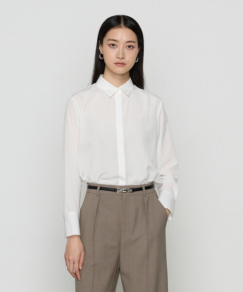 《デザイン》 毎年人気のストライププリントに新色無地を加えて登場です。 ベーシックなデザインでコムサ定番のシャツです。 身幅や肩幅に程よく、ゆとりのある一着です。 ジャケットインにはもちろんニットのインナー、一枚でさらりと着ても様になります。 落ち感のあるソフトな生地なのでインしてもごわつかず、レイヤードスタイルに重宝するアイテムです。 《素材》01:シロしなやかでパウダータッチの風合いと優しい膨らみを持った上質なデシンです。 04:シロ×グレーストライプ05:シロ×クロストライプパウダーデシンは京都の加工場でストライププリントを施しています。 柔らかくソフトな風合いが特長です。 お手入れ:手洗い/ドライクリーニング/ウェットクリーニング