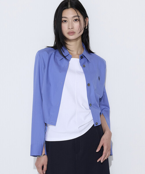 《デザイン》 シャツとショートジャケットの間のようなトラッドなクロップドシャツです。 着た際にウエストに向けて、ほんの少しだけ入るシルエットがシャープな印象です。 あえて大きめのボタンを配置し、羽織としても長い期間着られます。 袖下のコンシールファスナーを開ければ、暑い季節も涼しく、モードな着こなしが叶います。 左胸にはCOMME CAの全てのロゴを入れたモノグラム刺繍を入れています。 《素材》 たて糸に120/20コンパクト交撚糸、よこ糸には極細100/1を高密度に織り上げた先染めストライプです。 毛羽が少なく光沢感があり、ツルツルとした高級感のある風合いに仕上げています。 〈コットンブロード液アニ加工〉たてよこ共に50/1を使用したブロードに特殊加工を施すことにより、綿100%にも関わらず、合織のような反発感を出した風合いが特長の素材です。 液体アンモニア加工を合わせることにより、少し落ち感のある柔らかい風合いに仕上げています。
