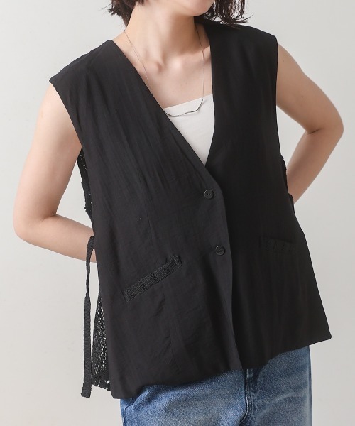 ■POINT いつものコーデにプラスするだけでオシャレ感がUPするバックレースのジレ。細部までこだわり抜かれたデザインのジレが洗練された印象を与えます。後ろ身頃は透け感のあるレース素材で軽やかに仕上げ、後ろ姿まで抜け目ないデザインになっています。 ■FABRIC 仕立て映えのする、さらりとしたドライタッチな肌触りの生地を使用。 ■COORDINATE ベーシックな着こなしもトレンドの着こなしも叶い、着回し力のある1枚です。フォーマルなシーンはもちろん、デイリー使いにも◎ロゴTシャツやブラウスにも合わせ頂けて着映えるアイテムです。 ………………… 透け感:後ろ身頃のみあり 裏地:あり ………………… ★商品のお気に入り登録 登録すると、完売しても再入荷時に通知を受け取ることができます。 ほかにもお得な特典があるかもしれません♪ ★ブランドのお気に入り登録 新商品や再入荷などの情報を受け取ることができますので、是非ご登録ください♪