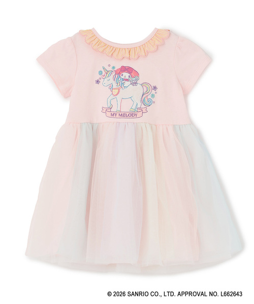 ふわふわなユニコーンに乗ったサンリオキャラクターズが目を引くワンピースです。 オフホワイトにはシナモロールとミルク、ピンクにはマイメロディ、ラベンダーにはクロミのアップリケをデザイン。 スカート部分は6色のチュールを組み合わせ、カラフルでふんわりとした雰囲気に仕上げました。 後ろの衿ぐりはゴム仕様のため、簡単にお着替えできるのも魅力です。 内側にお名前を記入できるタグがついています。 【おすすめの着用時期は春夏シーズン】 【透け感】透けない 【生地の厚さ】普通 【伸縮性】あり 【裏地】あり 【ポケット】なし