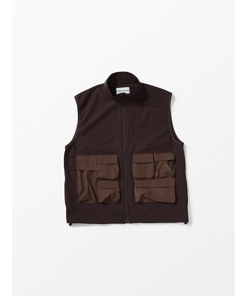 ■マルチポケットのスタンドカラージップアップベスト。高い通気性を持ち軽量で、撥水加工も施された東レの高機能素材「DotAir(R)」を使用。フロントには高強度と撥水、透湿性を備えたリップストップナイロンを使用した、マチ付きのポケットが配置されています。左胸にはワンポイントでブランドロゴをデザイン。春夏の様々なアイテムとのレイヤードを楽しみたい一着となっています。