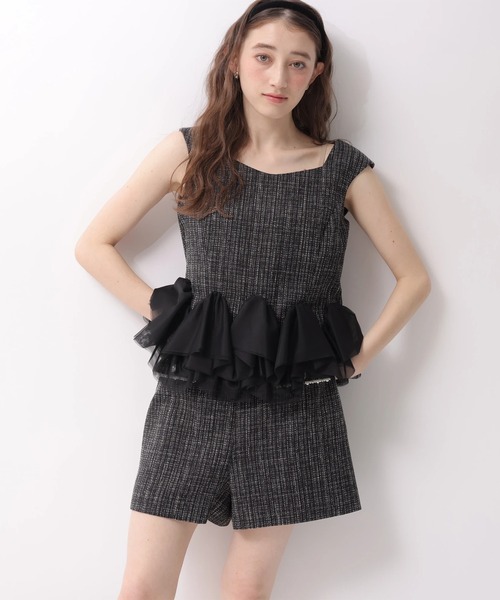 上品なツィード素材にビジュートリムをあしらったショートパンツ。 さりげなく煌めくディテールが、ミニマルなデザインに華やぎを添えます。 すっきりとしたシルエットで脚を美しく見せ、同素材トップスとセットアップ風に、シアーブラウス合わせで洗練されたきれいめスタイルにも映える一着です。 【ご注意】 ※撮影照明の関係により、実際の商品と色味が異なって見える場合がございます。 また、パソコン・スマートフォンなどの環境により、製品と画像のカラーが異なる場合もございます。 予めご了承ください。 ※商品画像はサンプルのため、色味やサイズ等の仕様に変更がある場合がございますので、予めご了承ください。