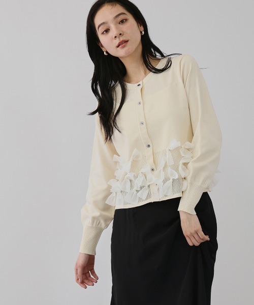 ●POINT 弾力感のある編地にシフォンリボンをふんだんに編み込んで、視線が奪われるドラマティックなニットカーディガンです。 程よく短めにセットした着丈で、ゆとりのあるシルエットで旬なフォルムバランスに仕上げました。 気温が低い日にはインナーにシアーなハイネックトップスを仕込んで一枚着風に。 気温が高くなってきたら、ワンピースなどとのレイヤードスタイルに。 同素材を使用したアイテムにブルーミングリボンニットベスト(2212-61127)がございます。 アンサンブルでのご着用も可能です。 ---------------------------------- 透け感:淡色のみややあり 厚さ: 普通 伸縮性:あり 裏地: なし ポケット: なし ---------------------------------- ---------------------------------------------------------------- 洗濯方法 家庭洗濯:液温は40℃を限度とし、手洗いができる。 自然乾燥:日陰の平干しがよい。 アイロン:底面温度160℃を限度としてアイロン仕上げができる。 ドライクリーニング:石油系溶剤による弱いドライクリーニングができる。 ---------------------------------------------------------------- ■モデル身長 165cm 着用サイズ M ※画像の商品はサンプルとなりますので実際の商品と仕様、加工、サイズが若干異なる場合がございます。 ※お客様のモニター環境により実際のお色と多少異なる場合がございます。 ※撮影状況や光の当たり具合により、色合いが異なって見える場合がございます。 ---------------------------------- ▼商品のお気に入り登録 ハートマークをクリックし、お好きなカラーを選んでお気に入りに登録 完売カラーの再入荷通知や、ラスト1点の通知、セールの通知も受け取ることができます。 ▼ブランドのお気に入り登録 新商品や再入荷等、いち早くブランドのお得な情報を受け取ることができます。 ----------------------------------