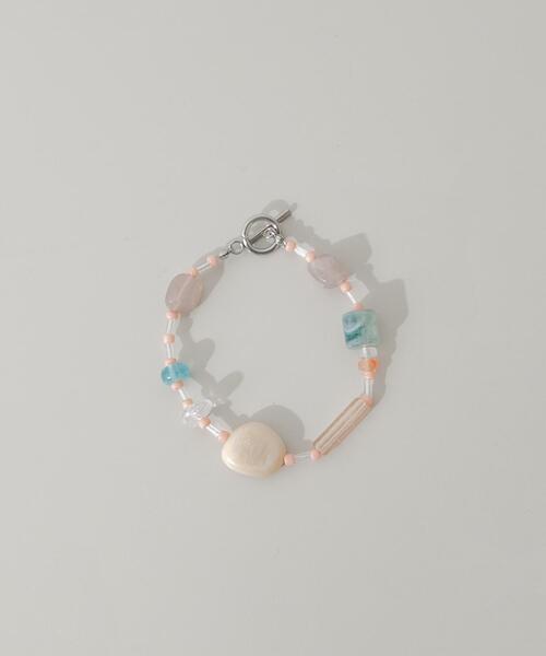 【プレイフルなアソートブレスレット】 ●形や色の異なるパーツを配した表情豊かなデザイン ●肌なじみの良いミルキーカラーをベースに、爽やかなブルーがアクセント ●肌に優しく錆びにくいサージカルステンレス素材 一つひとつのパーツに個性があり、眺めているだけで楽しい気分にさせてくれるブレスレットです。 マーブル調のパーツや透明感のあるビーズなど、質感の異なる素材を組み合わせることで、手元に奥行きのある華やかさを生み出しています。 全体を淡いトーンでまとめているので、多色使いながらも主張しすぎず、大人のカジュアルスタイルに品よく馴染んでくれますよ。 腐食に強く錆びにくいサージカルステンレスを採用した、金属アレルギーにも対応したアクセサリーです。 【2026 Spring/Summer】【26SS】 【サージカルステンレスとは・・】 ・通常のステンレス材よりも、より腐食に強く錆びにくい。 ・医療器具にも使用されており、金属アレルギーに対応した素材。 ・お風呂などの水に触れるシーンで付けっぱなしにしても、錆びたり変色したりしにくい。 ※アレルギーの原因はさまざまです。すべての方に起きないことをお約束するものではありませんので、予めご了承くださいませ。また、症状が出た場合は直ちに使用をお控えください。 ※アレルギー体質の方や体調が低下している方など、かぶれることがありますので十分にご注意ください。 ※サージカルステンレスは、腐食に強く錆びにくい特徴がございますが、製品状態を永久保証するものではございません。使用状況によって劣化は異なりますので、ご了承ください。 ※その他お取り扱いに関しましては、商品に付属のアテンションタグをご覧ください。 ※アクセサリーは壊れやすいものです。取り扱いに注意していただき大切にご使用いただけるようお願い申し上げます。 総重量 : 約6.5g ※商品画像は、光の当たり具合やパソコンなどの閲覧環境により、実際の色味と異なって見える場合がございます。予めご了承ください。 ※商品の色味の目安は、商品単体の画像をご参照ください。 ▼お気に入り登録のおすすめ▼ お気に入り登録商品は、マイページにて現在の価格情報や在庫状況の確認が可能です。 お買い物リストの管理にぜひご利用下さい。 -