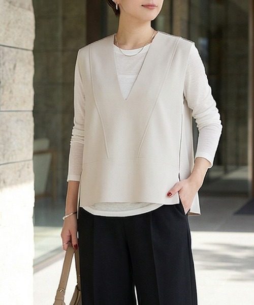 ストレッチジョーゼット生地を使用した、ゆったりフォルムのスタイリッシュなベスト。薄く軽やかな着心地で春夏を中心に着られ、季節を問わず活躍します。サラッとした肌離れの良い質感に適度なハリがあり、体のラインを拾いにくく自然に体型をカバー。洗えてシワになりにくく、扱いやすさも魅力です。 シンプルなデザインで、無地Tシャツなどの上に重ねるだけでコーディネートが整う便利な一枚。お腹周りや腰回りをさりげなくカバーしながら、程よくきれいめで大人っぽい雰囲気を演出します。 インナーは長袖・半袖・ノースリーブを問わず合わせやすく、パンツやスカートはもちろんワンピースとのレイヤードにも対応。シンプルながら着回しの幅が広く、さまざまなスタイルに取り入れやすいアイテムです。 【その他の仕様】 ◆着用時期:春夏をメインに通年 ◆サイズ感:ゆったりとしたサイズ感 ◆丈感:ヒップが半分隠れる程度(前後差あり) ◆シルエット:ストレート ◆首元:深いVネック ◆肩幅:問わないタイプ ◆アームホール:広め ◆厚み:やや薄手 ◆柔らかさ:柔らかさの中に少しハリ感もあり ◆肌触り:サラサラして少し弾力がある ◆着用ジワ:できにくい ◆毛羽立ち:できにくい ◆伸縮性:あり ◆光沢感:なし ◆透け感:なし ◆スリット:フロント裾の両端にあり ◆ボタンやファスナー:なし ◆ポケット:なし ◆裏地:なし ◆手洗い:可能 ◆アイロン:不要 ◆スチーマー:使用OK 【お色について】 ◆ブラック:定番的な通常のブラックです。 ◆エクリュ:ライトベージュと白の中間のようなお色。クリーム系ではなくややグレイッシュ系で、白と重ねると同化しない程度に深みや色味感があります。