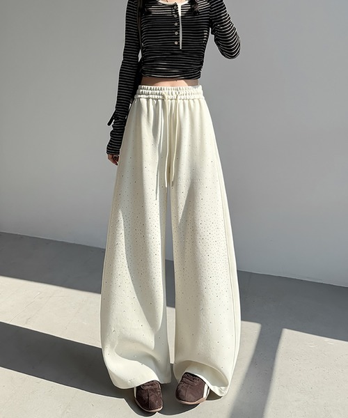 ラフなのに華やか。スパンコールが光るカーブパンツ。 ■デザイン 全体的にビジューをあしらった、華やかさとカジュアルさを両立したスウェットパンツ。 脚のラインに沿ってゆるやかにカーブした“カーブパンツ”シルエットで、自然に脚がまっすぐ長く見えるデザイン。 ウエストはドローストリング仕様で、ラフに穿けるのにスタイルアップが叶う一本。 ワイドすぎず細すぎない絶妙なラインで、デイリーにもお出かけにも使える万能さが魅力。 ■素材 - 柔らかく肌あたりの良いスウェット素材で、ストレスフリーな穿き心地。 - 程よい厚みでシーズンレスに使いやすい。 - スパンコール部分は軽量で、派手すぎず上品な輝き。 - カーブシルエットがきれいに出る、落ち感のある素材感。 ■スタイル - スウェット×スパンコールで、ラフなのに華やかな“抜け感カジュアル”に。 - シンプルなトップスと合わせるだけでコーデが決まる主役パンツ。 - クロップド丈トップスと合わせると脚長効果がさらにアップ。 - スニーカーやサボ合わせでデイリーカジュアルな着こなしがおすすめ。 ---------------- 透け感:なし 伸縮性:あり 裏地:なし ---------------- ------------------------------------ 【スタッフが着用しました!】 身長:158cm 普段着用サイズ:S~Mサイズ 今回着用サイズ:FREEサイズ ■ 着用感 - ウエストゴムでラクに穿けるのに、カーブラインで脚がきれいに見える。 - ワイドすぎないシルエットで、体型を拾わずすっきり。 - スパンコールが軽く、動いてもチクチクしにくい。 - 1日中穿いても疲れない軽さと柔らかさ。 ------------------------------------ 【お買い物をよりお楽しみいただく為に】 ▼お気に入り登録 サイズ・カラーを指定して、♡マークをクリック![セール通知・ラスト1点の通知・完売アイテムの再入荷通知]を受け取ることができます。 ▼ブランドのお気に入り登録 新商品や再入荷、タイムセールやクーポン等いち早くブランドのお得な情報を受け取ることができます。 ------------------------------- ※取り扱い上のご注意 染色の特性上、発汗や摩擦により色落ちしたり他のものに色移りすることがありますのでご注意ください。 韓国ファッション オフィスカジュアル ガーリー 大人カジュアル