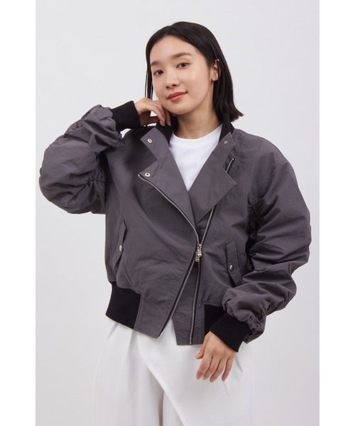 ■ TORUNE ■ 【DESIGN】 ライダース×MA-1のハイブリッド。モードとフェミニンが共存するギャザリングブルゾン。 ライダースのタフさとMA-1のカジュアルさを巧みに融合させた、主役級のハイブリッドブルゾンが登場。 素材には程よいハリと光沢が上品な「ナイロングログラン」を使用。 最大の魅力は、コンパクトな着丈と、対照的にたっぷりとしたボリュームを持たせたワイドシルエット。袖に施されたギャザーが立体的なラインを描き、モードテックな佇まいの中に女性らしい柔らかさを演出します。 ハイウエストのボトムスとも相性が良く、羽織るだけでスタイルアップと旬の空気感を両立してくれる一着です。 【TEXTILE】 素材には、密度高く織り上げられた「ナイロングログラン」を採用。 グログラン特有の横畝(よこうね)が生地に豊かな表情を与え、一般的なナイロン素材よりも肉厚で、高級感のあるマットな光沢が特徴です。 最大のメリットは、その優れた「保形性」。 しっかりとハリのある生地を使用することで、袖のギャザーやワイドなシルエットがへたることなく、立体的なフォルムを美しく保ちます。丈夫でシワになりにくく、デイリーユースでも品の良さを失わないテック素材です。
