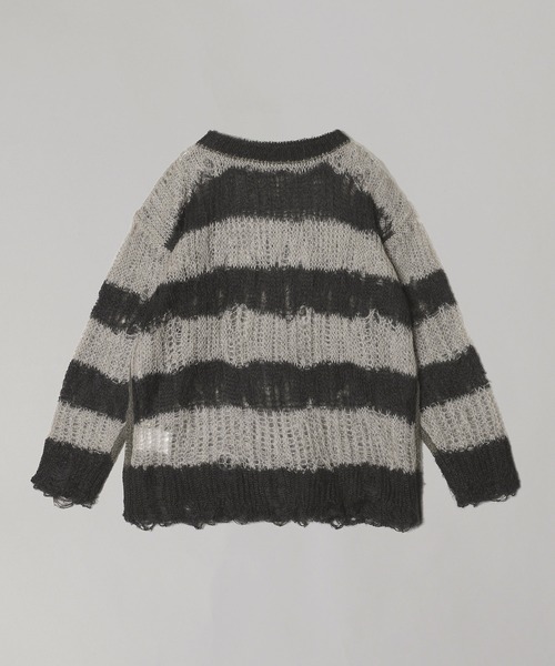 beautiful people 2025 AW Collection ―Detail― ・ストレートシルエットの4wayクルーネックプルオーバー ・前身頃と後ろ身頃とその中間にも身体を通すことが出来る ・身頃を1枚めくり返す前後同色に変化 ・針抜きとぼろ柄をボーダーに掛け合わせたオリジナリティある 柄行きが特徴 ・2色の糸を重ねることで編むことで透け感と柄の立体感を楽しめる ・配色リンキング仕様 ―Fabric― ・南アフリカ産の柔らかなキッドモヘアの梳毛糸でループ糸加工を加えたモヘヤを使用 ・天然繊維のみで形成されているため、肌触りの良さとモヘヤ特有の光沢感がポイント ・撚糸ループを起毛しているためやや毛抜けがしにくいのが特徴 透け感:あり 裏地:なし 伸縮性:あり 光沢感:なし 生地の厚さ:薄手 ポケット:なし <beautiful people|ビューティフルピープル> ビューティフルピープル(beautiful people)は、熊切 秀典氏による日本のファッションブランド。 着る人たちに喜びや心地良さをもたらし、あるがままのあなたを美しいと感じさせる洋服をデザイン。 世界の多様性を肯定し、日常の中にあるさまざまな要素、時に相反するものや矛盾する概念の中にある新たな美を見出します。 サイズ、性別、素材、パターン、色など、ファッションにおける既成概念や先入観から着る人たちを開放し、個人個人の中にある真実の美しさを引き出す、新たなスタンダードを生み出しています。