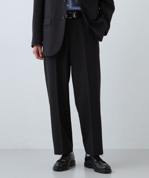 【新シルエット】 ワイドテーパードパンツは、腰や太もも周りにゆとりがありつつ、裾に向かって細くなるシルエットが特徴で、リラックス感とすっきりとした印象を両立できるアイテムです。 きれいめからカジュアルまで幅広いコーディネートに活躍します。 【シルエットの特徴】 ■ゆったり:ヒップから太ももにかけてゆったりとし、そこから裾に向けては少しテーパード気味のシルエット ■スッキリ:全体的にはゆったりとしながらもスッキリ見えする ■リラックス感:身体のラインを拾いにくく体型カバーしやすいシルエット 【着こなしのポイント】 ■きれいめアイテムとの組み合わせ:ワイドパンツのカジュアルさを抑えるため、きれいめなトップスやアウターと合わせると、大人っぽいこなれ感を演出できます ■ビジネスに:室内での着用やクールビスにも適しているが、少しカジュアルダウンした印象になる ■トレンド感:現代風のモードなスタイルやリラックス感 【仕様】 ・ポケット数:横×2 後ろ×2 ・前ファスナー ・ウエスト後ろゴム ・裏地なし ※照明の関係により、実際よりも色味が違って見える場合があります。また、パソコン・スマートフォンなどの環境により、若干製品と画像のカラーが異なる場合もございます。 モデル情報:身長180cm B84 W67 H90 着用サイズ:03(L) 店舗へのお問い合わせ商品番号:616-75106 ●製品寸法: 01(S):W88cm H109cm 股下69cm 前股上28cm 渡り幅35cm 裾幅21cm 02(M):W92cm H113cm 股下69cm 前股上28cm 渡り幅36cm 裾幅21cm 03(L):W96cm H117cm 股下70cm 前股上29cm 渡り幅37cm 裾幅22cm 04(LL):W100cm H121cm 股下72cm 前股上29cm 渡り幅38cm 裾幅22cm 備考: