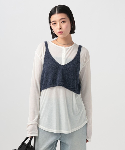 モコモコした表面感が特徴的なコンパクト丈のニットキャミビスチェ ーーー ★おすすめポイント★ [1]表面感がありつつドライタッチな肌触り [2]前後2WAY仕様 [3]シャツやロンTに重ねるだけでトレンド感あるコーデに [4]スタイルUP ーーー [fabric] モコモコとしたブークレーの表面感がありつつドライタッチな肌触りが特徴。 [design] UネックとVネックの衿デザイン違いで着用できる2WAY仕様がうれしいポイント。 華奢な肩ヒモが女性らしい印象に。 [styling] お尻がかぶる程度の着丈があるシャツやTシャツの上に重ねたレイヤードコーデがおすすめ。 コンパクトな着丈感が目線を誘導し、スタイルUPして見えるのもうれしいポイント。 ------------------------------------- ≪お買い物をよりお楽しみいただくために≫ ◆商品のお気に入り登録(ハートマークをクリック) 完売カラーの再入荷通知や、完売間近の通知、セールの通知も受けることができます。 ◆ブランドのお気に入り登録 新商品や再入荷など、いち早くブランドのお得な情報を受け取ることができます。 -------------------------------------
