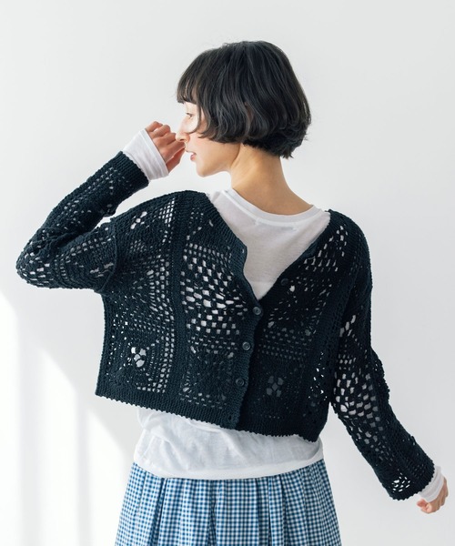 コンパクトな丈感ですっきり見え 甘さを抑えたクラフト感が魅力の2WAYニット ーーー 【素材】 綿混のナチュラルな素材を使用しています。 レース編み機で繊細に編み立てることで、手編みのようなクラフト感がありながらも、軽やかな着心地です。 【デザイン】 前後どちらを前にしても着用できるダブルフロント仕様。ボタンを前にして羽織りとしてはもちろん、ボタンを後ろにすればプルオーバーとしても楽しめる着回しの効くデザイン。 全体をコンパクトな丈感とスッキリとしたシルエットにまとめることで、カギ針編み風の質感を活かしつつ、シックで洗練された印象に仕上げました。 ーーー 【スタイリング】 キャミソールやタンクトップの上からさらりと羽織るのはもちろん、ボタンをすべて留めてプルオーバーとして着こなすのもおすすめです。 ショート丈なので、ボリュームのあるワイドパンツやロングスカートとも相性抜群。 ワンピースの上に重ねてシルエットに変化をつけたりと、一着で何通りもの表情を楽しめる万能なアイテムです。