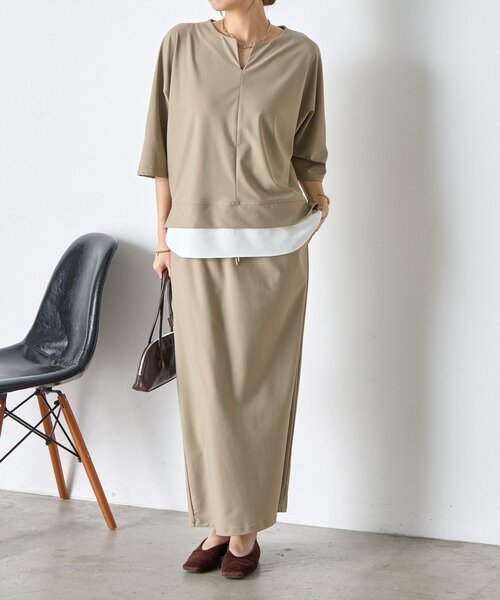 ー商品ポイントー ・開きすぎないVネックラインが上品さを演出。 ・ゆったりとしたシルエットで、気になる二の腕をさりげなくカバー。 ・前後差のある丈感で、おしゃれな抜け感をプラスしました。 ・スカートは、すとんと落ちるIラインシルエット。 ・ウエストはゴム仕様で、リラックスした着心地。 ・レイヤード風のデザインのプルオーバーは、カジュアルすぎずに着ていただけます。 ーマテリアルー ■透け感:なし ■裏地:なし ■伸縮性:あり ■光沢感:なし ー洗濯方法ー 洗濯機可能(弱弱) ー注意事項ー 商品の画像はできるだけ実物に近い色味で掲載しておりますが、ご覧になるモニターや照明の環境により、実際の色味と若干異なって見える場合がございます。 あらかじめご了承くださいませ。 ・画像の商品はサンプルです。 実際の商品と仕様、加工が若干異なる場合があります。 ・サイズ表記はあくまで目安となります。 __________________________________ ※取り扱いについては、商品についている品質表示でご確認ください。 ※照明の関係により、実際よりも色味が違って見える場合があります。 またパソコン・スマートフォンなどの環境により、若干製品と画像のカラーが異なる場合もございます。予めご了承ください。 ※詳細画像の色合いをご参照ください。予めご了承ください。 __________________________________ 【お買い物をよりお楽しみいただくために♪ 】 ▼ 商品のお気に入り登録 お気に入りアイテムのお値下げ・再入荷・在庫ラスト1点など通知を受けることができます。 ▼ブランドのお気に入り登録 Jena espace merveilleuxの新商品や再入荷、セール、クーポン配布などお得な情報を受けることができます。