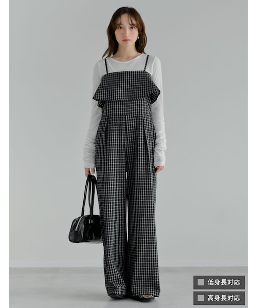 ▼デザイン大人が着られるシック配色チェックで仕上げたキャミオールインワン。ビスチェとパンツを着用しているようなルックスが特徴で、これ1枚で旬の着こなしが完成します。パンツ部分は、タック入りで美脚見えするゆったりとしたシルエットに。上半身は抜け感のあるデザインでメリハリをプラス。脚が長くハイウエストに見えるような絶妙なバランスにこだわりました。バスト後ろ部分にはゴムも入っているため、見た目以上に着心地はストレスフリー。サッカー素材は夏場も涼しく着用でき、暑い季節にもぴったりです。▼コーディネート春先は長袖のTシャツやカットソーを合わせて、夏はカップ付きキャミソールを合わせて1枚での着用はもちろん、軽い羽織りを取り入れるのもおすすめ◎チェック柄ですが、ベースがモノトーンのため、小物やシューズも悩まずコーディネートを楽しんでいただけます。BBQや公園遊び、ちょっとしたレジャー・アウトドア等にもおすすめです。▼素材シボ感のある軽やかなサッカー生地▼低身長向けC(コンパクト)サイズ対応身長150~155cmくらいの方がバランスよく着ていただける丈感のリエディオリジナルサイズです。▼高身長向けT(トール)サイズ対応身長165~170cmくらいの方がバランスよく着ていただける丈感のリエディオリジナルサイズです。▼お取り扱いについて※この製品は摩擦(特に湿った状態での摩擦)や、汗や雨などで濡れた際に、他の衣類や下着(特に白)等に色移りする場合がありますので十分にご注意ください。※色移りした場合は、速やかに洗濯またはクリーニングに出してください。※洗濯やクリーニングの際、多少色落ちすることがありますので、単品洗い、単品クリーニングをしてください。洗剤の量が多いと、色落ちの度合いが高くなりますのでご注意ください。※速やかに脱水、乾燥をしていただけますようお願いいたします。