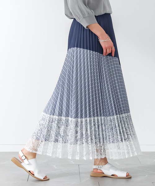 \無地×ストライプ×レース♪/ 『足元に「透け感」と「抜け感」を宿す。』 見れば見るほど好きになる。計算されたグラデーション異素材ドッキングプリーツスカート 【 3素材が奏でる洗練のコントラスト 】 無地・ストライプ生地・レースの3素材で仕立て、奥行きと足元に軽さを出したプリーツスカートです。 質感の異なる素材を贅沢にドッキング。 腰周りは濃色の無地でスッキリと引き締め、裾に向かってストライプ、レースへと移り変わるデザインが、足元に軽やかな「抜け感」を演出します。 【 ストレスフリーな美シルエット 】 ウエストは総ゴム仕様で、締め付け感のない楽な穿き心地のロングスカート。 プリーツの縦ラインが強調され、一日中穿いていても疲れにくいのに、品格のある佇まいをキープします。 【 プリーツを美しく保つこだわりデザイン】 適度なハリでプリーツを美しく保つ、さらりと柔らかな無地とストライプ生地を使用しています。 足元のプリーツレースは滑らかで柔らかく、繊細な動きを添えてくれます。 さらっと肌すべりの良い裏地付きで、春から秋までロングシーズン心地よくご着用いただけます。 【 カジュアルから上品な装いまで 】 デニムシャツを合わせたカジュアルダウンから、ブラウスを合わせたきれいめスタイルまで。 サンダルやブーツなど、足元の抜け感を活かした幅広いシューズ選びを楽しめます。 ■製品についての注意書き この製品はプリーツ加工を施していますが永久的なものではなく、着用や水洗い、クリーニングを繰り返す事によりプリーツが消失する恐れがあります。 洗濯はネットを使用し、脱水は短時間で処理し直ちに干してください。 ご了承の上、ご購入いただきますようお願いいたします。 ......................................... n'OrLABEL ほかにない、私のデイリーウェア 毎日の生活を心地よく自分らしく過ごすための服。 遊び心を取り入れた、大人のカジュアルスタイル。 .........................................