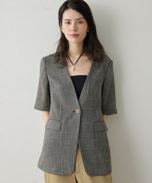 【2026SS】 夏の羽織りとしてオンオフで着回したい半袖ジャケット ■表情感のある生地で仕立てたハーフスリーブジャケット。 ■さらさらとした清涼感のある着心地が、暑いシーズンに嬉しい一着。 ■深いV型のノーカラー+一つボタンのデザインが首周りをすっきりと見せ、タンクトップやキャミソールに羽織るだけで計算された抜け感を演出。 ■肘下まで隠れるハーフスリーブが二の腕をカバーしつつ、クラシックで落ち着いた印象をプラス。 ■テーラードほど堅苦しくなくカーディガンよりもしっかり見え、夏のおしゃれな羽織としてオンオフで着回せるアイテム。 【MATERIAL】 糸に特殊加工を施したスラブ糸を使用したカラミ織の織物。 梳毛のような高級感のあるタッチでありながら、イージーケアと快適な着心地を両立したシワにもなりにくい素材。 ---------------------------------------------------- 洗濯方法:手洗い可能 透け感:あり 裏地:なし 伸縮性:なし 光沢感:なし ---------------------------------------------------- ―Drawing Numbers(ドローイングナンバーズ) ― シンプルで洗練されたこだわり、「ハイスタイル」をコンセプトに 世界中からヒト・コト・モノが集まるショップ。 人々が楽しみ、気持ち良さを感じる世界を描いていきます。 【注意事項】 ・画像の商品はサンプルです。実際の商品と仕様、加工が若干異なる場合があります。 また 、パソコンやスマートフォンのモニター環境などにより、色味が違って見える場合があります。 ・店頭及び屋外での撮影画像は、光の当たり具合で色味が違って見える場合があります。 商品の色味は、スタジオ撮影の画像をご参照ください。 ・入荷状況により、お届け予定が前後する場合があります。 ・お客様への発送が店頭販売より遅れる場合があります。 ・追加生産商品は、一部の店舗、通販で販売中の場合があります。 予めご了承下さい。 【気になるアイテムは、「お気に入り」登録を】 ハートマークをクリックしておくことで、スムーズにお買い物が楽しめます。 ・ラスト一点のお知らせ ・再入荷のお知らせ ・SALEのご案内