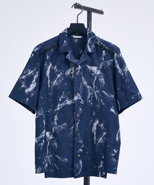 モードの静けさと夏の軽さを、織りで纏う Smoke Jacquard S/S Shirt 【素材】 デニムライクな質感の細番手コットンを用いた国産ジャガードを使用。スモークグラデーションを織りで再現し、奥行きのある表情に。さらりとしたタッチで真夏も快適です。ヤーンダイならではの深い発色がスタイリングを格上げします。 【デザイン】 端正なオープンカラーとやや短めの着丈の半袖シャツ。肩~背中に配した細ラインが後ろ姿まで引き締め、夏らしい抜け感と都会的なキレを両立します。 【コーディネート】 単品での着用はもちろん、同素材ショートパンツ(品番:02520051076)と合わせたセットアップスタイルもオススメです。