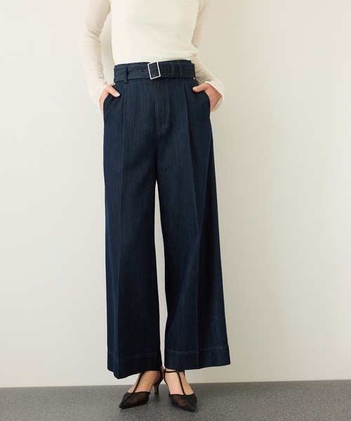 オフィスから休日まできれいめにも着こなせる、夏も快適な軽やかデニムライクパンツ 【デザイン・シルエット】 ハイウエストで1枚で決まるワンタックデニムベルテッドパンツ。 柔らかいリヨセル混のきれいめデニム素材を使用し、スラックスのような上品なディテールと、すっきりとした腰回りのパターンでスタイルアップ効果も抜群。デニムながら洗練されたシルエットで、カジュアルからきれいめまで幅広く着こなせます。 【おすすめのスタイリング】 シアーや畦編みのようなサマーニットやシャツとのコーディネートがおすすめ。 ウエストベルトでメリハリを出し、トップスをインすればよりスマートな印象に。 オフィスカジュアルやデイリーコーデ、休日のきれいめカジュアルまで活躍する1本です。 【素材】 8.4オンスのリヨセル混ライトデニムを使用。 柔らかく落ち感のある素材で、夏でも快適に着用可能。 軽やかな素材感ながら形をきれいに保ち、1日中快適な着心地を実現します。 ---------------------------- 透け感:なし 裏地:なし 伸縮性:なし 光沢感:なし 生地の厚さ:薄手 ポケット:あり 開き方:ファスナー ---------------------------- 【モデル情報】 モデル身長:171cm 着用サイズ:38 【ベルテッドパンツシリーズ】 同型で素材違いの ライトテンセルデニムベルテッドワイドパンツ(品番:GGS26110) リネン混ギンガムチェックワイドパンツ(品番:GGS26160) がございます。 ※画像の商品はサンプルです。実際の商品と仕様、加工、サイズが異なる場合がございます。 ※撮影場所やライティング、お使いのモニター環境によって色の見え方が異なる場合がございます。 ※商品のカラーは画像の色味をご参照ください。動画は仕様説明のため、色味が実物と異なる場合がございます。