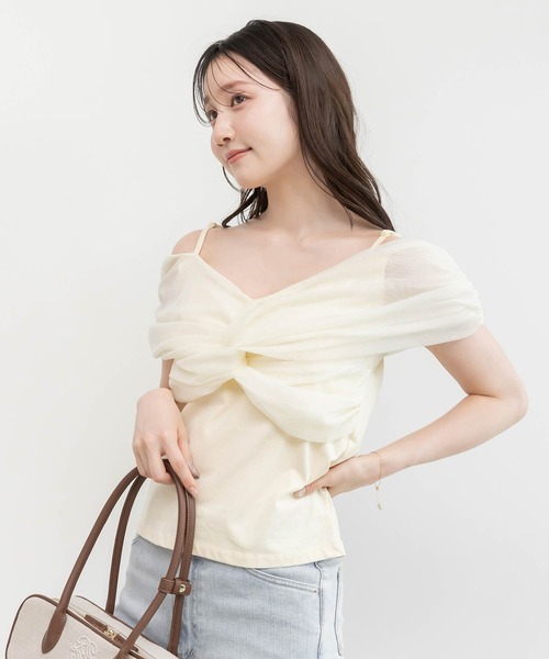 ◆2026SS新商品◆ 異素材の組み合わせが目を惹く、フェミニンなオフショルダーカットソー。 リボンのようなクロスデザインで、着るだけで華やかさが際立つ一枚です。 POINT ・身頃にはさらっとした肌触りのカットソー素材を使用し、快適な着心地を実現 ・襟部分にはチュール素材を使用し、軽やかで女性らしい印象に ・ホワイトとイエローは柔らかな無地チュール素材、ブラックはドットチュールで程よいアクセントをプラス ・オフショルダーデザインで、デコルテラインを美しく演出 ・肩紐付きで安定感があり、長さ調節も可能 ・フロントはクロスデザインになっており、立体感のある仕上がり ・肩線にはギャザーを入れ、自然なボリューム感を演出 COORDINATE フレアスカートやデニムパンツと合わせて、カジュアルフェミニンな着こなしに。 ジャケットのインナーとしても、程よく華やかさをプラスできます。 - - - - - - - - - - - - - - - 洗濯方法:手洗い可 透け感:チュール部分あり、身頃部分なし 裏地:なし 伸縮性:身頃部分あり、チュール部分なし 生地の厚さ:普通 - - - - - - - - - - - - - - -