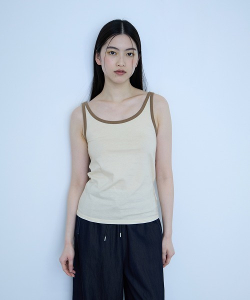 ●POINT 配色パイピングがアクセントになったバイカラーデザインで、一枚でもさまになるタンクトップ。 コンパクトなシルエットで程よくヘルシーな印象に。シンプルな中にもデザイン性があり、夏の主役トップスとして活躍。 程よい肉感と心地よい柔らかな風合いで1枚でも安心感のある着用感が魅力。 ワイドパンツやデニムと合わせてバランス良く、女性らしいスタイリングに。 シャツやシアーアイテムとのレイヤードもおすすめで、春夏通して長く楽しめる1枚。 シンプルなコーディネートのアクセントに。 ---------------------------------- 透け感:淡色のみややあり 厚さ: 普通 伸縮性:あり 裏地: なし ポケット: なし ---------------------------------- ---------------------------------------------------------------- 洗濯方法 家庭洗濯:液温は40℃を限度とし、手洗いができる。 自然乾燥:日蔭の吊り干しがよい。 アイロン:底面温度120℃を限度としてアイロン仕上げができる。 ドライクリーニング:石油系溶剤による弱いドライクリーニングができる。 ---------------------------------------------------------------- ■モデル身長 165cm 着用サイズ M ※画像の商品はサンプルとなりますので実際の商品と仕様、加工、サイズが若干異なる場合がございます。 ※お客様のモニター環境により実際のお色と多少異なる場合がございます。 ※撮影状況や光の当たり具合により、色合いが異なって見える場合がございます。 ---------------------------------- ▼商品のお気に入り登録 ハートマークをクリックし、お好きなカラーを選んでお気に入りに登録 完売カラーの再入荷通知や、ラスト1点の通知、セールの通知も受け取ることができます。 ▼ブランドのお気に入り登録 新商品や再入荷等、いち早くブランドのお得な情報を受け取ることができます。 ----------------------------------
