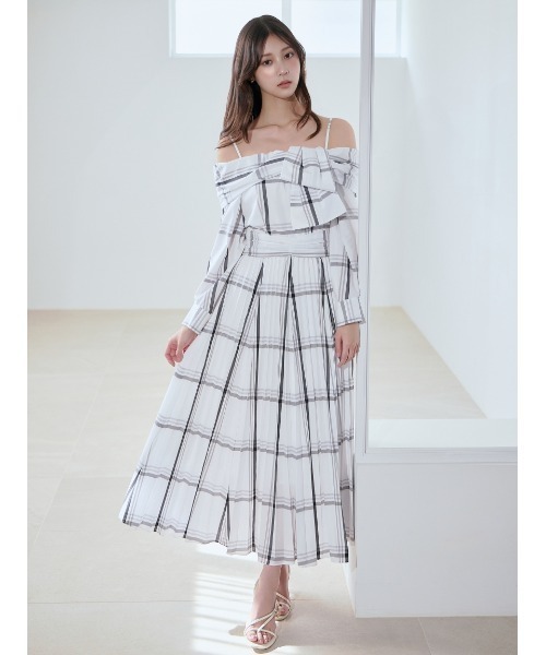 【エレガンスが引き立つビッグリボンシャツワンピース】 【Design/Styling】 胸元をふんわりと包みこむリボンディテールとプリーツをたっぷりと入れたフレアスカートラインが華やかなビッグリボンシャツワンピースです。オフショル風のビッグリボンデザインで、顔まわりを明るく演出。長さ調節可能なキャミストラップ付きなので安心してご着用いただけます。ギャザーをたっぷりと入れた太幅の腰位置高めのウエストベルトでウエストをシェイプ。背中側はゴムシャーリングを施しているので、身体にフィットしつつ着心地良く仕上げています。ロングスカート部分は繊細なプリーツで縦ラインを強調し、ドラマティックに仕上げました。袖口のカフスにもギャザーを入れ、くるみボタンを配置して手元も美しく演出します。ライトな着心地で普段使いにも、フォーマルにも使えるクラス感のあるアイテムです。サイドのコンシールファスナーで着脱可能。 【Fabric】 無地のクリーンなホワイト、爽やかな色味のトレンド感のあるブルー、ホワイト生地にブラックのクラシカルなチェックの3色展開。綿・ポリエステルの軽やかな生地を使用。 透け感:なし 裏地:なし 伸縮性:なし 光沢感:なし 生地の厚さ:普通 ※照明の関係により、実際よりも色味が違って見える場合があります。 またパソコン・スマートフォンなどの環境により、若干製品と画像のカラーが異なる場合もございます。予めご了承ください。 商品の色味は、商品単品画像をご参照下さい。 ※商品画像はサンプルのため、色味やサイズ等の仕様に変更がある場合がございますので、予めご了承ください。