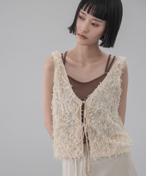 ■素材■ スラブ状に紡績された 毛足の長いフェザー素材を使用しています。 ■デザイン■ 前後2wayで着用ができるアイテムです。 肩は華奢さを出すため少し細めに。 適度にゆとりもあるサイズ感で着やすく仕上げました。 ■スタイリング■ シンプルにデニムと合わせてもかわいいですし、 スカートを合わせたガーリーな着こなしも◎。 シアートップスなど、軽さのあるアイテムと合わせるのもオススメです。