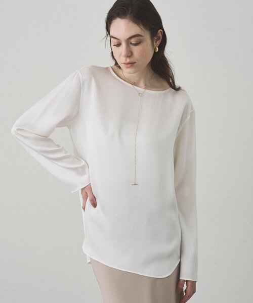 【定番商品】 エレガントに着こなせる、大人のシンプルTブラウス ■シルクライクなサテン生地が上品なプルオーバーブラウス。 ■ナチュラルなシワ感と柔らかな光沢のある風合い魅力。 ■やや長めなワイドストレートの袖に、裾をラウンドさせたシルエットが一枚でもサマになるデザイン。 ■首元はデコルテのきれいに見える緩やかなボートネックで女性らしさをプラス。 ■一枚でサラリと着こなすのはもちろん、ツルツルと滑りが良くニットやスウェットなどのレイヤードインナーとしてもおすすめ。 【MATERIAL】 シルクのような上品な光沢と滑らかな風合いが特徴のサテン生地。 【PICK UP REVIEW】 ■ホワイト|38size|身長158cm ジャケットの下に着るトップスを探していて購入しました。程よい透け感でサラっときれて、一枚でもジャケットの下にでも、インナーとしても毎回重宝しています。買って良かったです。 ■ホワイト|38size|身長163cm レイヤード用として購入。結果、レイヤード以外にも、単品でも、素材と形がキレイでマルチに使えます。オールシーズン使えます。 【STAFF COMMENT】 ■身長158cm|普段サイズ S~M|着用サイズ 38 シルクに見える素材ですが扱いはとても楽ちん。シワもそれほど気になりません。首元は横に開いているのでお手持ちのニットやスウェットで重ねた時も綺麗に重なってくれます。 ■身長167cm|普段サイズ S~M|着用サイズ 38 人気のサテンボートブラウス!単体でも、インナーでも、重ね着でも万能な1枚です◎ボートネックで適度に抜け感があるので、ジャケットを羽織っても首が詰まりすぎないですし、重ね着しても、変に襟が出てくることがなく綺麗です。 ---------------------------------------------------- 洗濯方法:手洗い可 透け感:あり 裏地:なし 伸縮性:なし 光沢感:あり ---------------------------------------------------- ―Drawing Numbers(ドローイングナンバーズ) ― シンプルで洗練されたこだわり、「ハイスタイル」をコンセプトに 世界中からヒト・コト・モノが集まるショップ。 人々が楽しみ、気持ち良さを感じる世界を描いていきます。 【注意事項】 ・画像の商品はサンプルです。実際の商品と仕様、加工が若干異なる場合があります。 また 、パソコンやスマートフォンのモニター環境などにより、色味が違って見える場合があります。 ・店頭及び屋外での撮影画像は、光の当たり具合で色味が違って見える場合があります。 商品の色味は、スタジオ撮影の画像をご参照ください。 ・入荷状況により、お届け予定が前後する場合があります。 ・お客様への発送が店頭販売より遅れる場合があります。 ・追加生産商品は、一部の店舗、通販で販売中の場合があります。 予めご了承下さい。 【気になるアイテムは、「お気に入り」登録を】 ハートマークをクリックしておくことで、スムーズにお買い物が楽しめます。 ・ラスト一点のお知らせ ・再入荷のお知らせ ・SALEのご案内