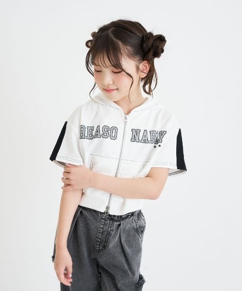 【デザイン】ライン切り替えやロゴプリントなどデザインが盛り沢山なパーカです。 コンパクトな丈のためジャストサイズで着るのがおすすめ。 ダブルジップになっており、上下どちらからも開くことができます。 【素材】 コットンを混ぜた薄手のミニ裏毛素材を使用。 【おすすめスタイリング】 ミニスカートやデニムパンツと好相性です。 ダメージ感のあるボーイッシュなボトムスを合わせても可愛く決まります。 #小学生コーデ #ガーリー #進級入学コーデ #通学コーデ #120cm #130cm #140cm #150cm #160cm ※照明の関係により、実際よりも色味が違って見える場合があります。 また、パソコン・スマートフォンなどの環境により、若干製品と画像のカラーが異なる場合もございます。 -・-・-・-・-・-・-・-・-・-・-・-・-・-・-・-・-・-・-・-・-・- 【透け感】透けない 【生地の厚さ】普通 【伸縮性】なし 【裏地】なし 【ポケット】あり
