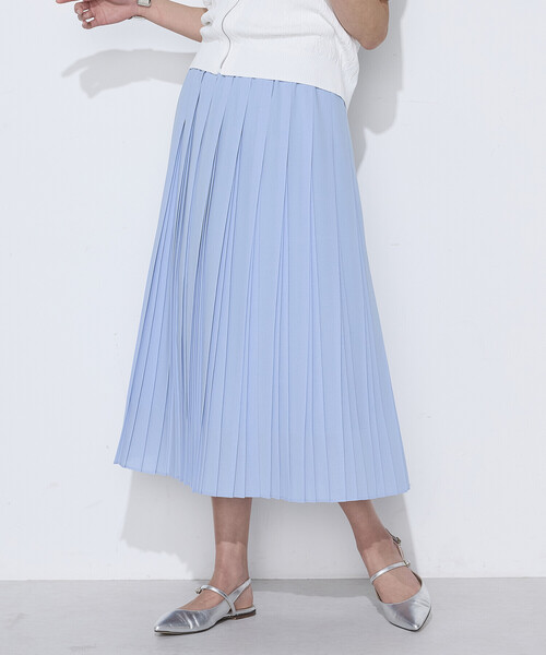 《デザイン》 裾に向かってシャープに広がる変形サイドプリーツスカートです。 長すぎない程良い着丈感がビジネスシーンにもカジュアルにも着回しやすい一着になります。 分量感がありつつも軽い素材感で風をはらむ、女性らしさを感じられる仕上がりです。 きちんと感がありつつ、ウエストのゴム仕様で着心地の良さも兼ね備えています。 《素材》 絶妙な膨らみがありつつ、程よいハリがあるボイル素材です。 微起毛感のある滑らかなタッチと繊細な表面感は合織でありながら、 梳毛のような質感が特長です。 ※お手入れ方法:手洗い可能