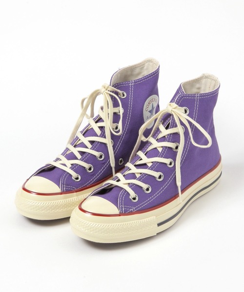 オールスター エイジドのカラーアレンジモデル ーーー 【デザイン】 オールスター エイジドのカラーアレンジモデル。 アーカイブモデルに見られる、テープのトリコラインを採用。 濃い生成りのテープ、シューレースを採用することでヴィンテージテイストを強調。 レトロでポップな雰囲気のスカイブルー、パープル、ピンクの3カラー展開です。 ALL STAR AGED SPEC ・洗い加工を施したアッパー ・艶出し加工を施した生成りテープ ・6ミリ幅のコットンシューレース ・光沢の強いハトメ ・クッション性に優れた高密度ウレタンフォームとラバースポンジのインソール ・トウスプリングを低めに設定したクラシックなシルエットのラスト ーーー 【スタイリング】 生成り色のパーツがデニムやチノパンなどのカジュアルアイテムと好相性◎ シンプルなコーデに取り入れるだけで春らしいカラーコーデが完成します。 スカート、ワンピース、ハーフパンツとの組み合わせがバランス良く収まります。